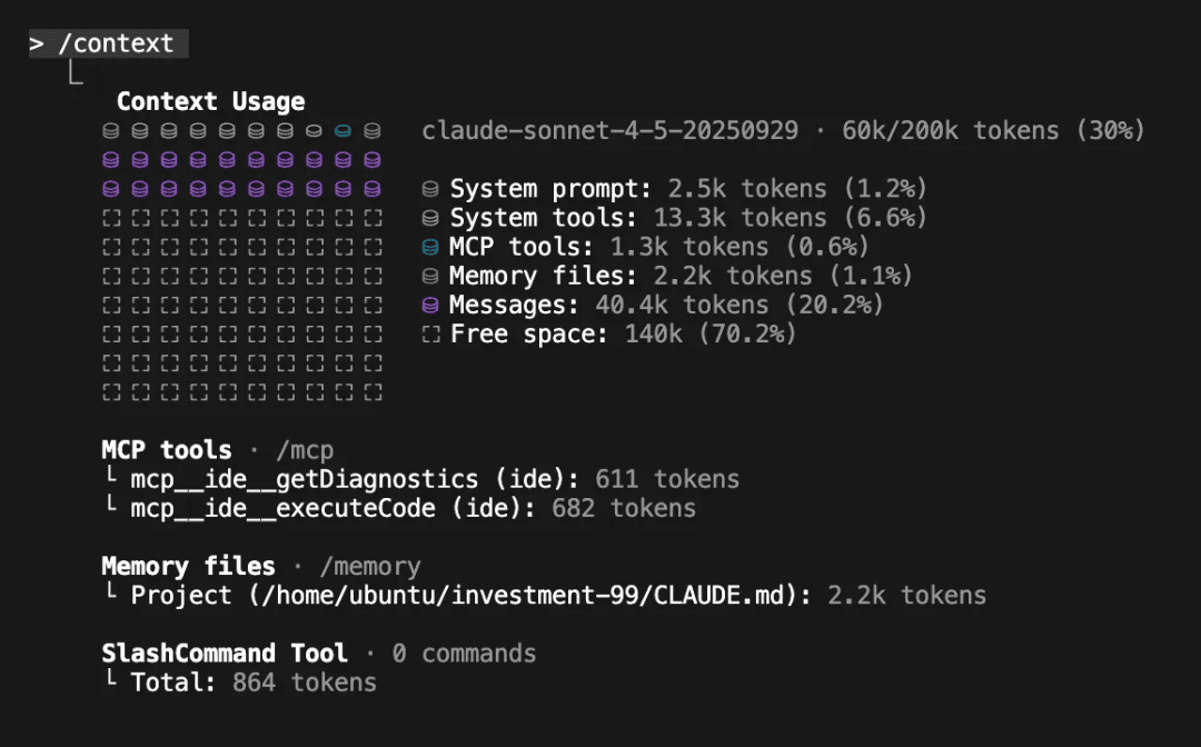 来了解你如何使用你的 200k token 上下文窗口(即使有 Sonnet-1M,我也不相信完整的上下文窗口真的被有效使用了)。对我们来说,在单体仓库中的新会话基础成本约为 20k tokens(10%),剩下的 180k 用于进行更改——这可能很快就会填满。
